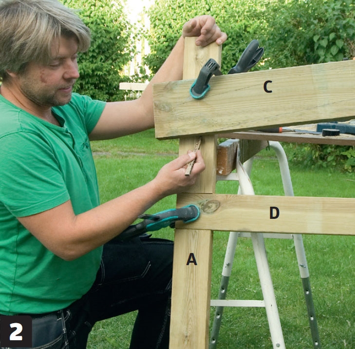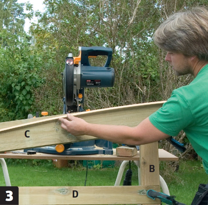 Vi bruker en list til å tegne opp den buede toppen (C). Vi bruker en bjelke som er bredere enn de andre, og vi bruker en bøybar list til å tegne etter. Listen settes fast med små spiker eller en tvinge.