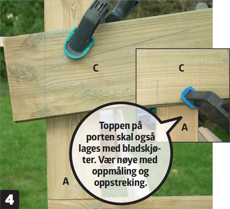 Vi merker av til portens topp (C). Som på resten av porten, lages også toppen med bladskjøter. Vi har laget sidene (B og A) ekstra lange, slik at det er litt å ta av.