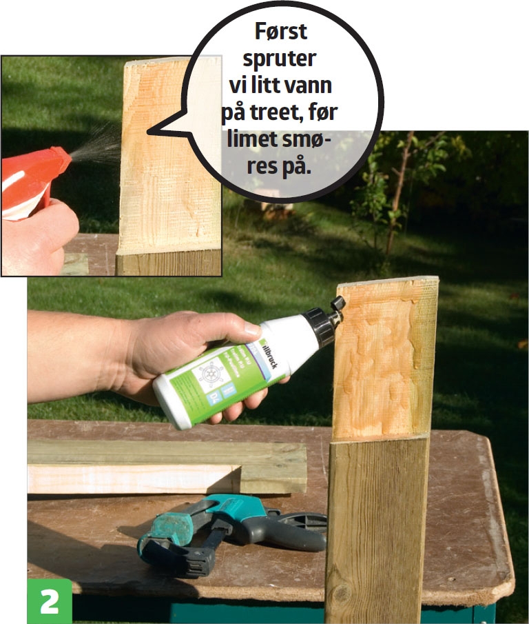 Smør lim på alle sammenføyningene. Vi bruker polyuretanlim. Det skummer opp, slik at limet trenger ned i alle små sprekker og ujevnheter i sammenføyningene.