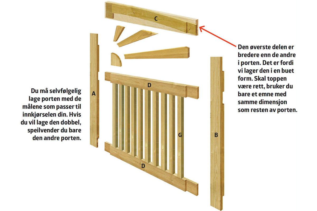 Sørg for at alle delene passer. Når vi har saget til toppen (C) og sikret at alt passer, kan vi begynne å lime sammen porten.