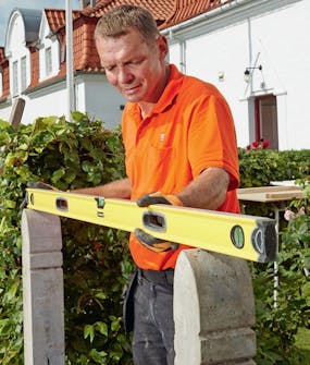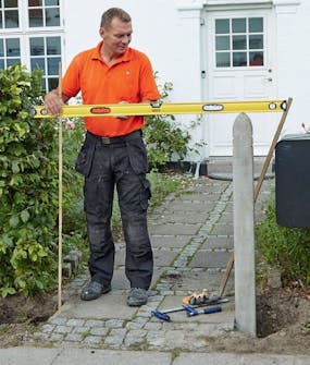 Toppen av stolpene settes i samme høyde. Kan du få hjelp til noe av jobben, så er det nå du skal benytte deg av muligheten. Det er mye enklere å rette opp stolpene hvis dere er to om jobben.