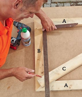 Mål opp til skråstiveren (C) på rammen. Mål 3,7 cm (halvparten av skråstiverens bredde) ut fra hjørnet, og lag en markering på begge sider. Da vet du hvor skråstiveren skal ligge når den strekes opp.