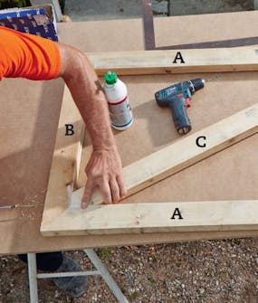 Rammedelene (A og B) kappes med skråsnitt, slik at de lange sidene måler henholdsvis 107 og 65 cm. Kappsagen gjør det enkelt å treffe nøyaktig 45 grader.