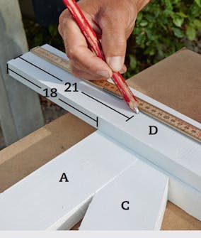 Marker på stavene (D), hvor skruene skal sitte. Stavene skal stikke ned 18 cm under rammen. Vi lager derfor et merke 21 og 80 cm over bunnen midt på stavene, slik at skruene vil sitte på en rett linje.
