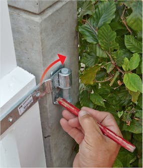 Vi merker opp til skruene til hengselet, der det skal sitte på stolpen. Stabelen, som delen kalles, skal helle litt vekk fra porten. Du merker dette når du holder opp delene for å lage markeringen.