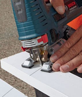 Buen skjærer vi med en stikksag. Vi setter sagen på 15 grader, så vannet renner av. Stavene skal være høyest på den pene siden mot gaten.