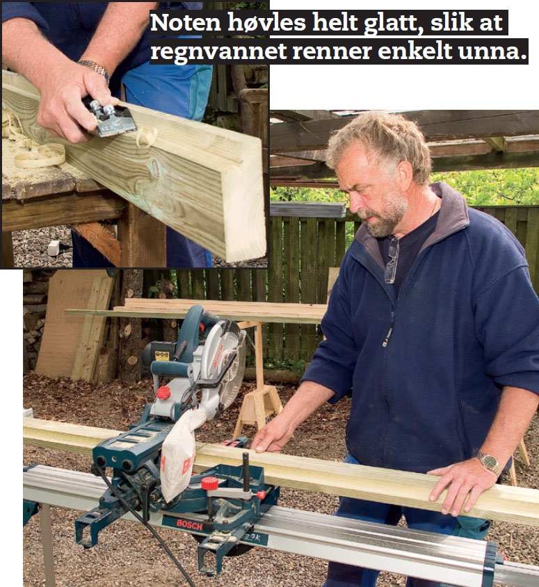 De to vannrette bjelkene på porten vil være mest utsatt for fukt. For å sikre at regnvannet renner raskt vekk, sager vi en skrå kant på begge de vannrette bjelkene. Endeveden på stavene beskytter vi ved å montere stavene i en not på rammen, og ved å skråskjære endene.