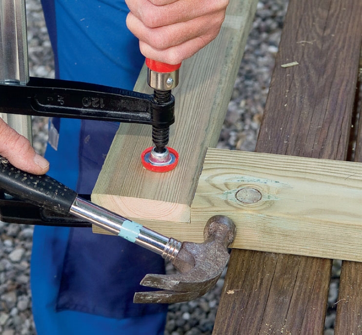 Som overliggere på pergolaen har vi brukt to forskjellige dimensjoner (73 x 73 og 98 x 98 mm). Dermed er det mulig å felle stolpene sammen - helt uten å bruke spiker eller skruer. Men dette kan bare la seg gjøre hvis stolpene dine er helt rette. Alternativt kan du forbore og skru en fransk treskrue ovenfra og ned i toppen av hver skjøt.