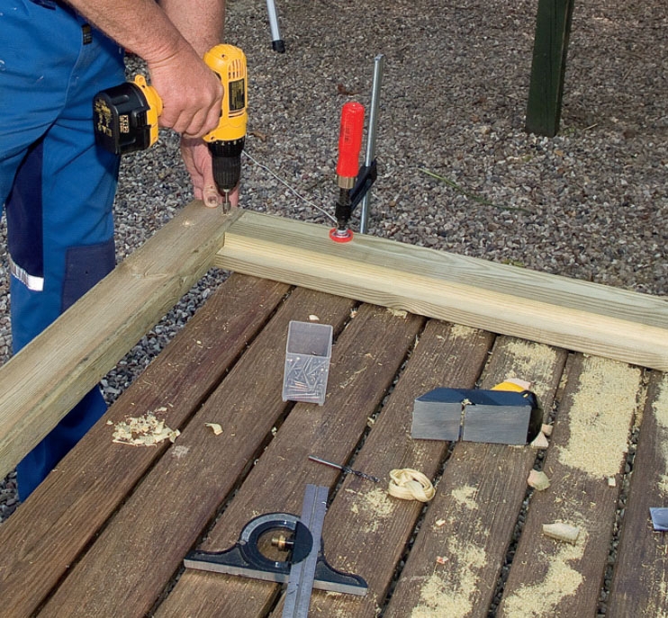 Du skal utføre et par vanskelige snitt med sirkelsagen når du bygger rammer til portene. Skjøtene på pergolaen er heller ikke lette.