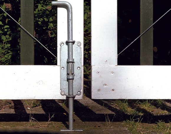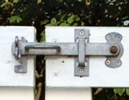 Når rammene og stavene til porten er malt og satt sammen, kan hengsler og beslag skrus fast. Mot vegg og stolperv skal porten henge i stabelhengsler. Til å åpne og lukke porten bruker vi en portlås. Og i midten av den dobbelte porten setter vi en skåte.