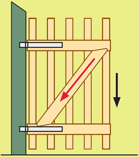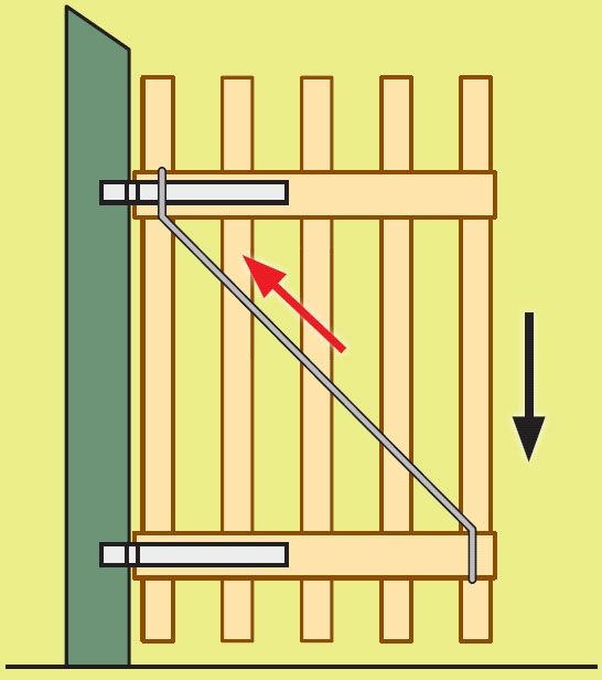 En wire monteres slik at den går fra øverste hjørne i hengselsiden og skrått ned. Det er stikk motsatt av en tradisjonell skråstiver av tre. Wiren henger fast i et mot hold i hver ende. Motholdet plasseres i en not (se bilde). Noten bores og stemmes ut i bladskjøten.