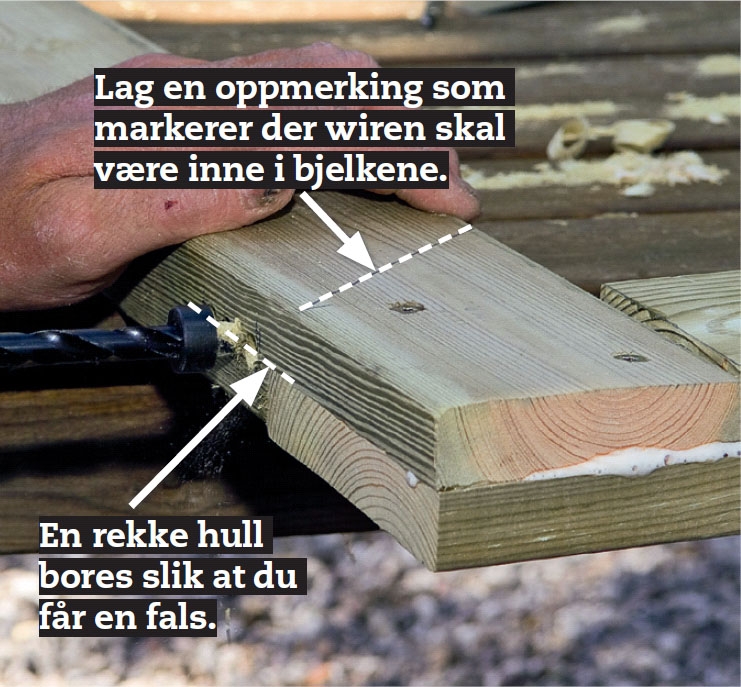 Sjekk en ekstra gang hvor wiren skal gå fra og til, før du borer et langt hull gjennom bladskjøten med et 6 mm bor. Hullet skal være cirka 10 cm langt. Hvis du ikke har et langt bor, er du nødt til å bore fra begge sider av bjelken.