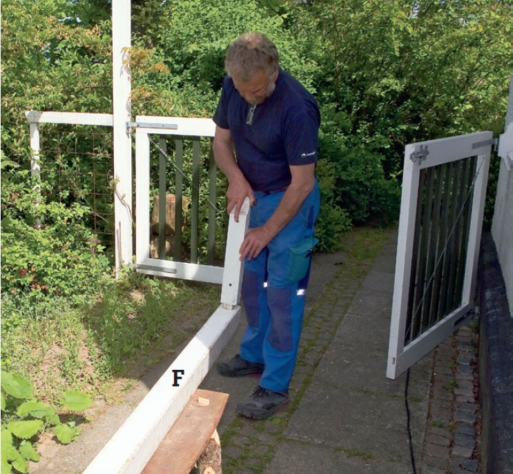 I portens vannrette bjelker (B) sager vi en not, som stavene (C) settes inn i. Noten er 24 mm dyp og 25 mm høy. Den får en skråkant, slik at vannet enkelt kan renne unna. Den skrå kanten her heller sju grader. Den kan gjerne helle mer.