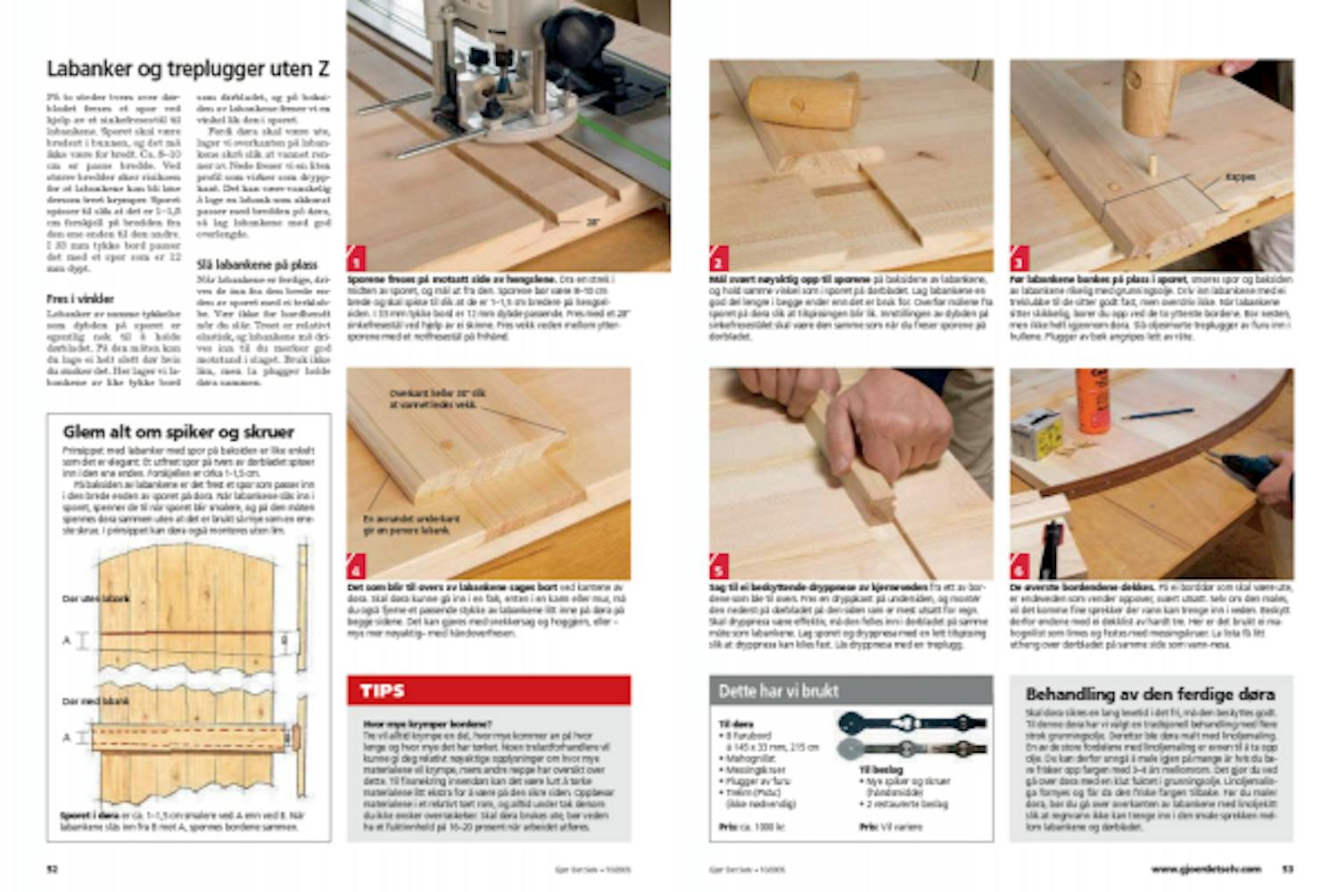 Limarbeidet bør gå forholdsvis raskt. Derfor kan det være lurt å foreta en generalprøve: Montér døra med løs-fjær, men uten lim, og se om alt passer som det skal. Går det bra, kan du trygt lime og spenne sammen. Ellers må du tilpasse etter hvert slik at døra blir nøyaktig som du vil ha den.