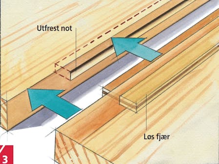 Bordene monteres sammen med ei løs fjær som sitter i skjøten mellom to bord. Det er flere fordeler ved å arbeide med løse fjærer i stedet for med not og fjær. Du utnytter de dyre materialene bedre - hvert bord er like bredt.