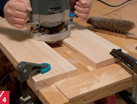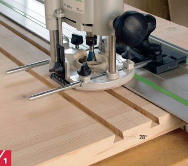Fres med et 28° sinkefresestål ved hjelp av ei skinne. Fres vekk veden mellom yttersporene med et notfresestål på frihånd.