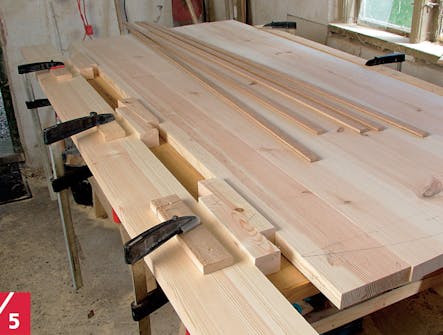 Legg de seks bordene i ønsket rekkefølge. Annet hvert bord er snudd slik at margved møter margved og splintved med splintved i sammenføyningene. Det gir det beste resultatet ved fukt-forandringer i veden.