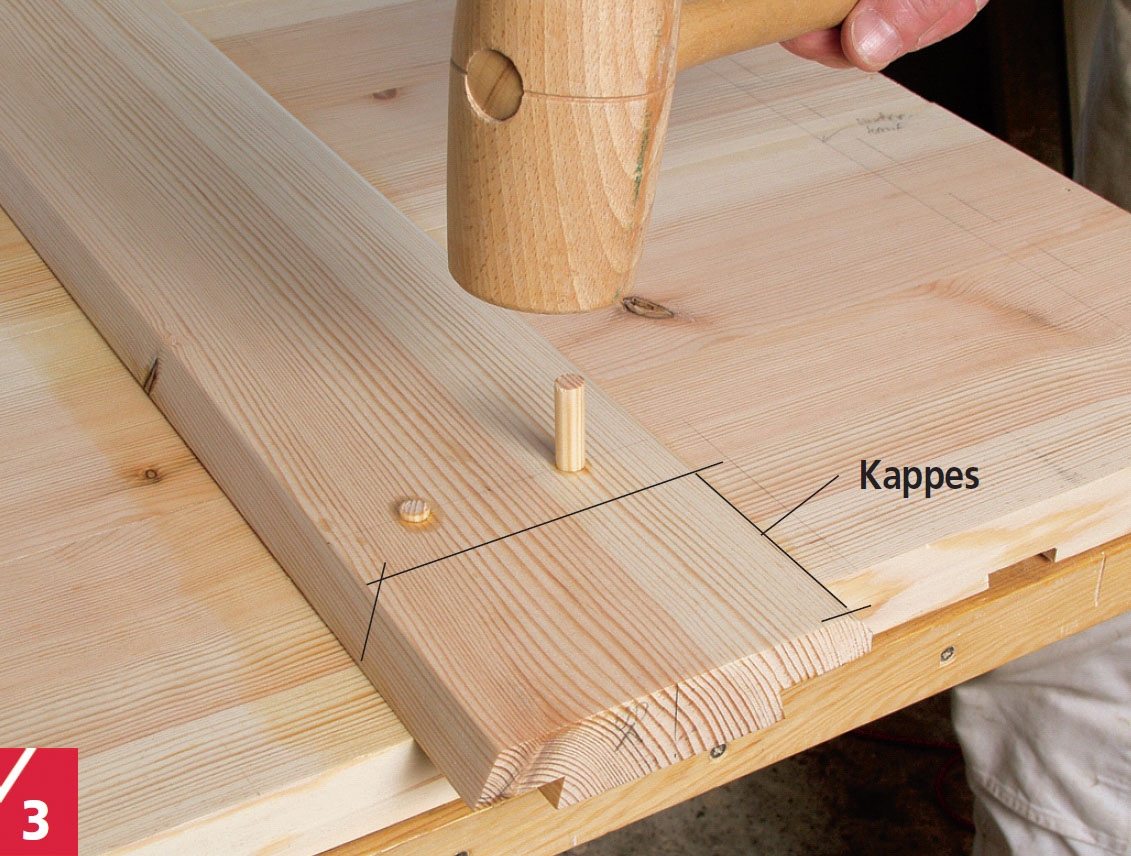 Når labankene sitter skikkelig, borer du opp ved de to ytterste bordene. Bor nesten, men ikke helt igjennom døra. Slå oljesmurte treplugger av furu inn i hullene. Plugger av bøk angripes lett av råte.