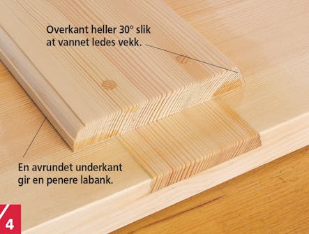De øverste bordendene dekkes. På ei borddør som skal være ute, er endeveden som vender oppover, svært utsatt. Selv om den males, vil det komme fine sprekker der vann kan trenge inn i veden. Beskytt derfor endene med ei dekklist av hardt tre.