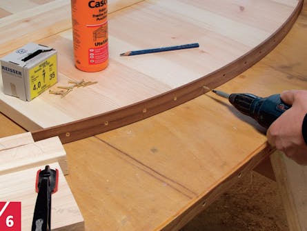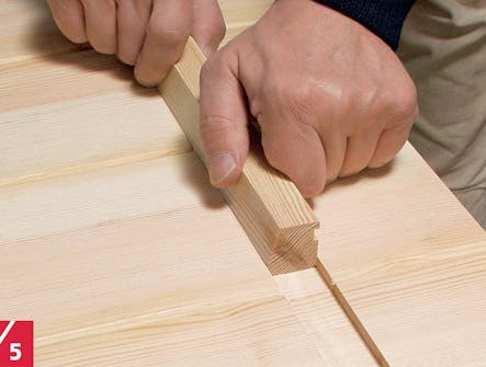 Lange skrutvinger kan brukes, men bedre og billigere er det å spenne med solide kiler på et kraftig arbeidsbord. Husk å beskytte arbeidsbordet med papir mot overflødig lim.