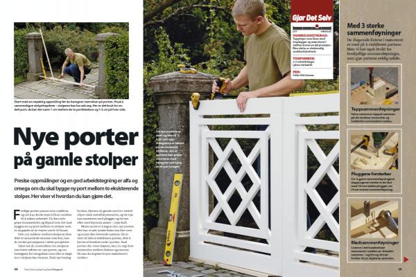 Bruk ei vinkelrett plate som underlag. La de utskårede delene følge platas sider. Så er du sikker på at portens ramme blir i vinkel. Legg ut delene til ramma slik som de skal skjøtes, og markér hvor tappene skal skjæres ut.