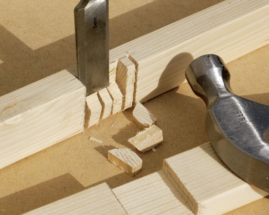 Med håndsag eller bakksag sages det halvt ned i listene ved krysskjøtene. Sag flere spor - så er det lettere å stemme ut hakkene med et skarpt stemmejern.