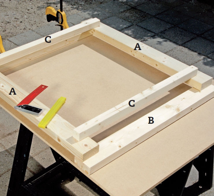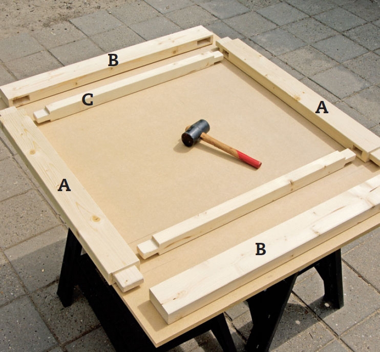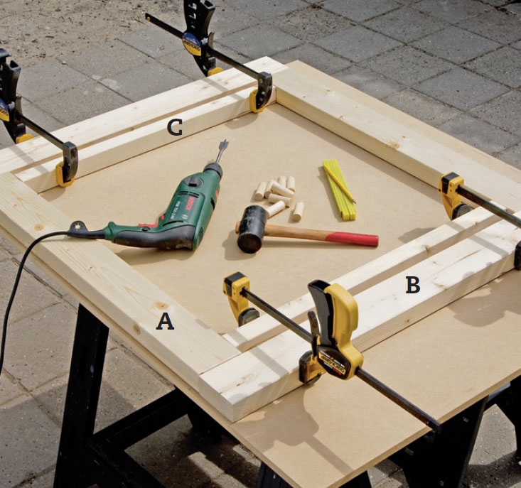Nå samles ramma midlertidig (uten lim). Slå først de to loddrette sidene (A) sammen med listene (C). Bruk en gummihammer. Slå deretter på bunn- og toppstykket (B). Trekk delene helt tett sammen ved hjelp av tvinger.