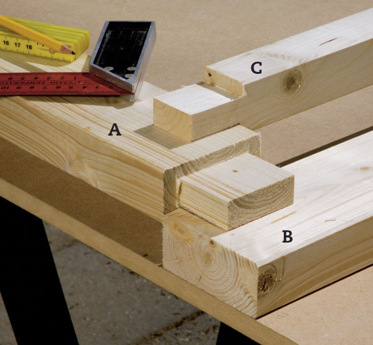 Ramma er samlet med tappsammen-føyninger som siden plugges sammen. Det er edelt tømrerhåndverk som gir en meget sterk skjøt. Har du ikke mot til å lage presise tappskjøter, kan du lage bladsammenføyninger (som de møn-strede «fyllinger» - se neste oppslag). Så bør du bare huske at A og C skal være lengre enn i projektet her, fordi de så skal gå helt inn over B og A. Men du bør fort-satt plugge, selv om du «blader» sammen.