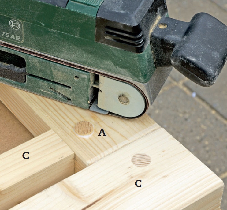 Markér midten av tapphullet og merk av med en syl der det skal bores. Til de brede tappene på rammedelene (A) skal det bores tre presise (vinkelrette) hull, og to nøyaktige hull til de smale tappene på listene (C).