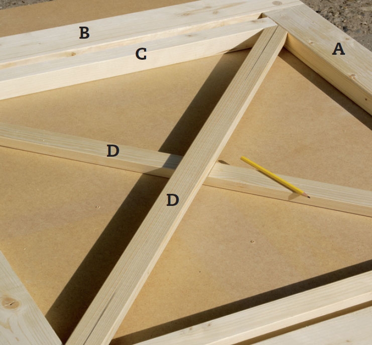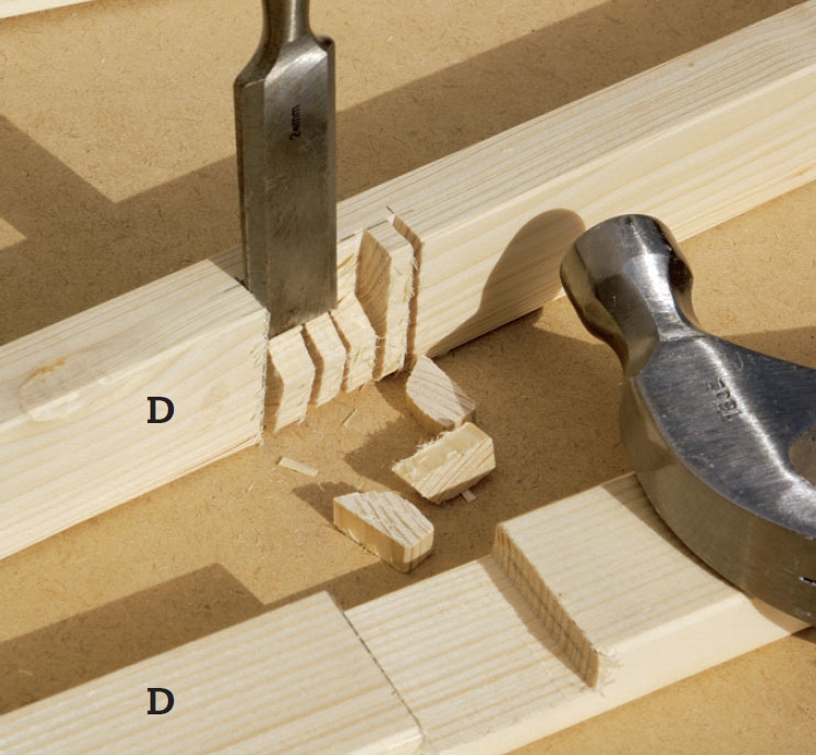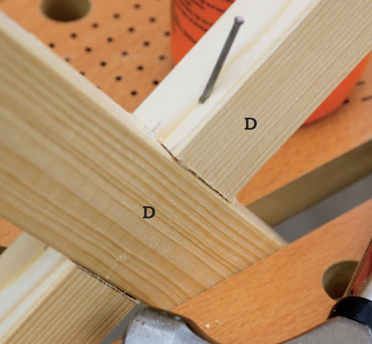 Legg de kryssede listene (D) fra hjørne til hjørne. Markér midten, og merk av hvor endene skal skjæres til i snitt på 45 grader, og sag ut. Legg listene oppå hverandre og tegn av hvor hakkene til skjøtene skal være.