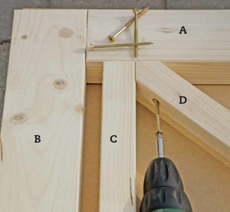 Legg det ytterste kvadratet (E) inn under de kryssende listene (D). Skru det fast med 4 x 40 mm skruer.