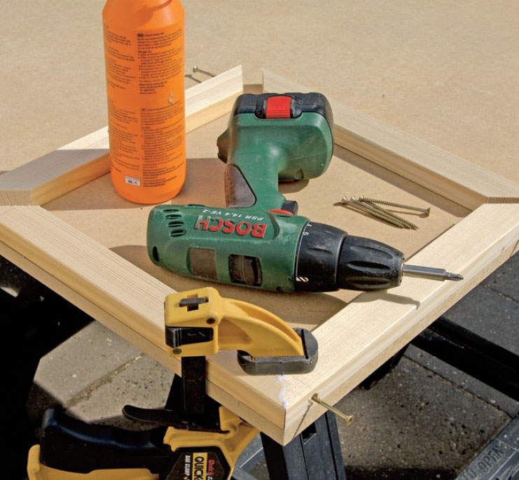 Skjøt de to kvadratene (E og F), som skal settes på de kryssende listene. Kvadratene skjøtes med lim og 5 x 70 mm skruer. Spenn dem fast til et rett-vinklet hjørne med en tvinge over en skjøt. Dermed sikrer du at rammene er i vinkel.