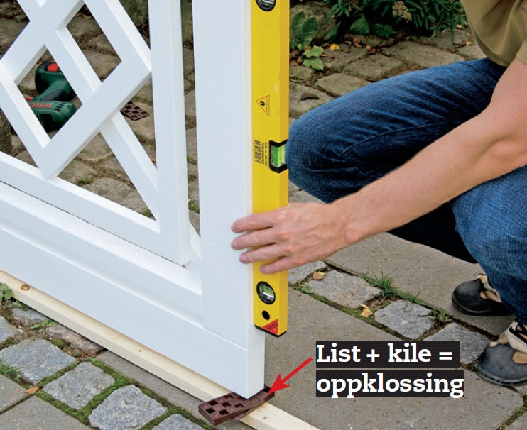Fest hengslene på hengselkrokene, og plassér porten slik at den er 3 cm over hellene. Legg ei 25 mm tykk list under for å sette på porten. Kloss porten opp med kiler eller tynne platestykker, inntil over- kanten er vannrett og sidene loddrette.