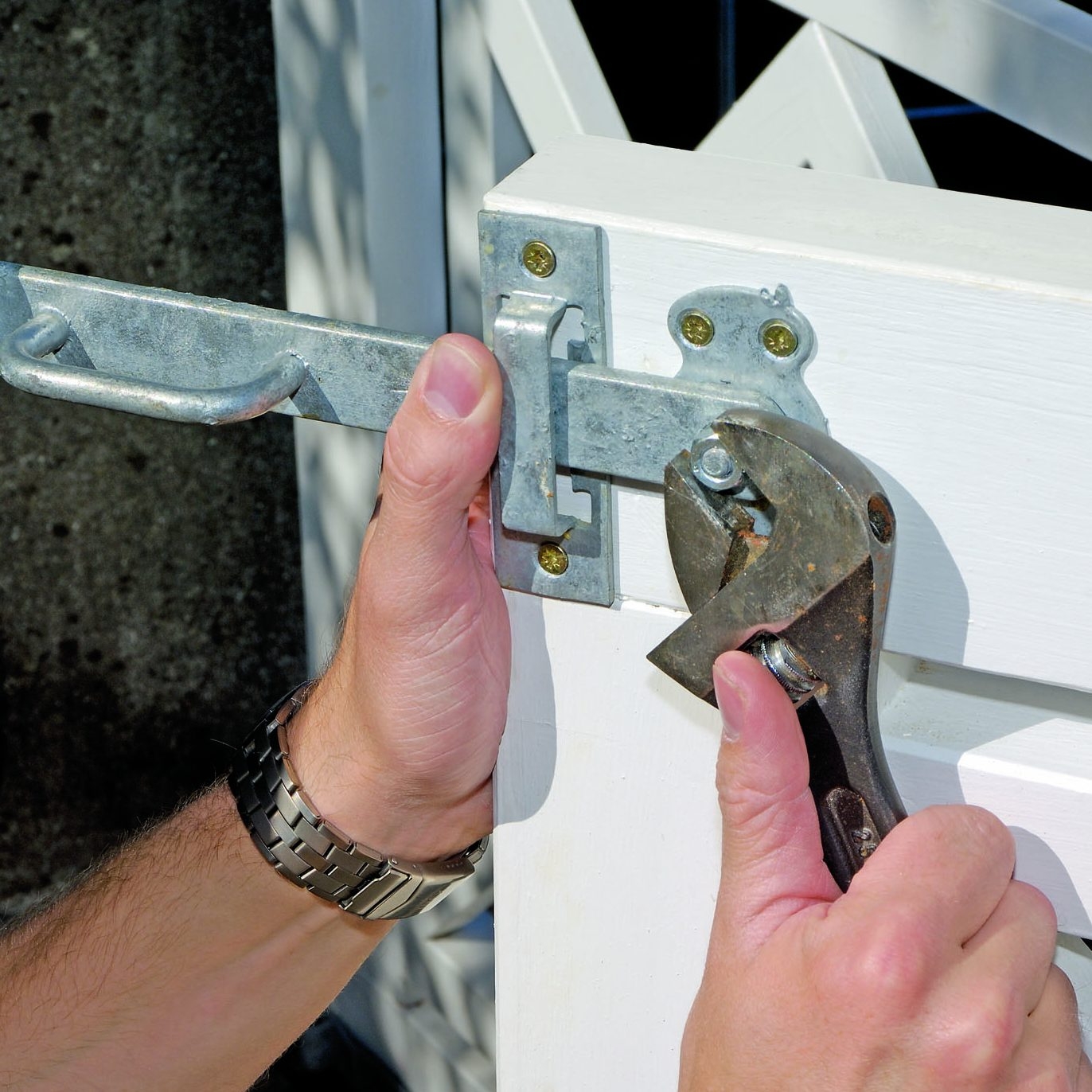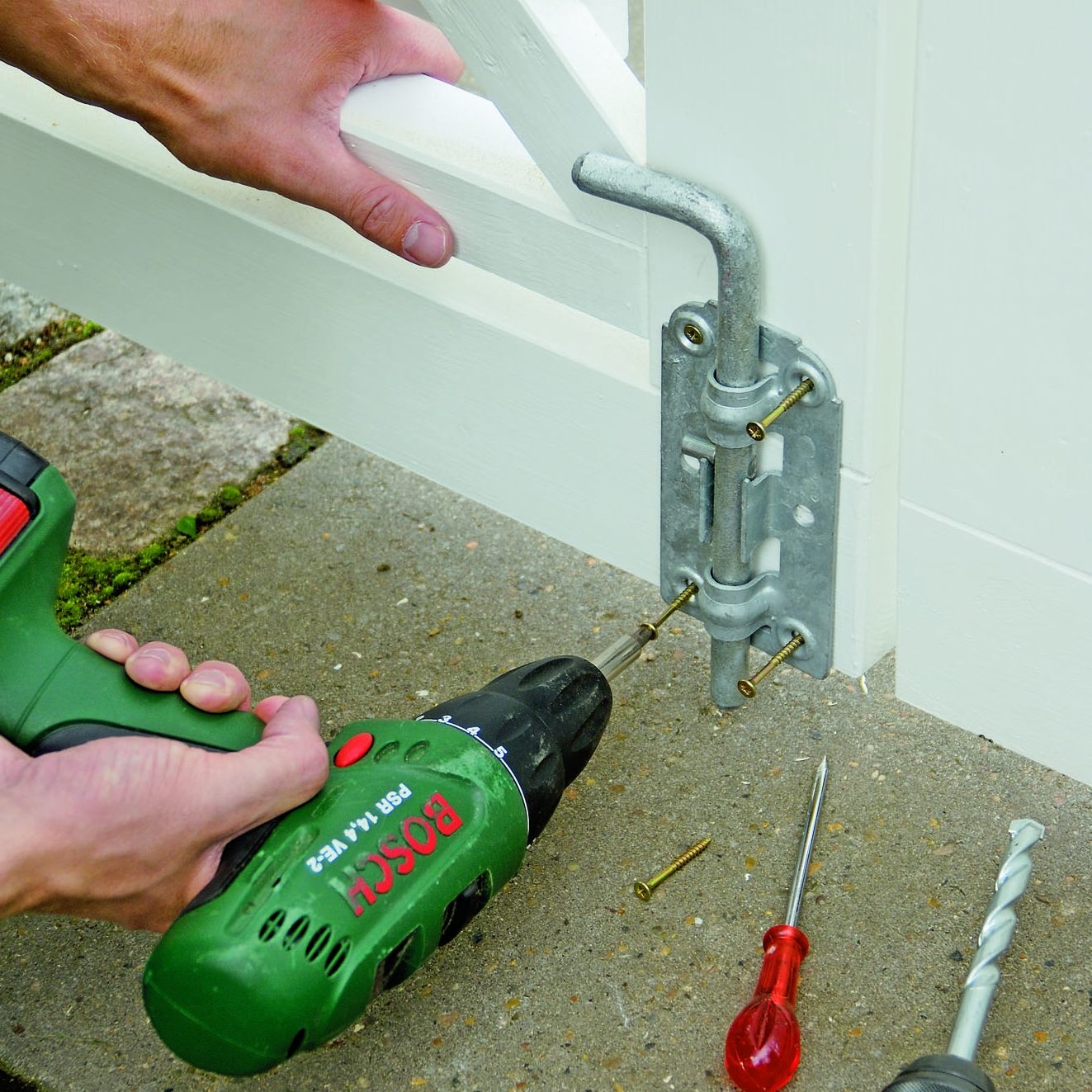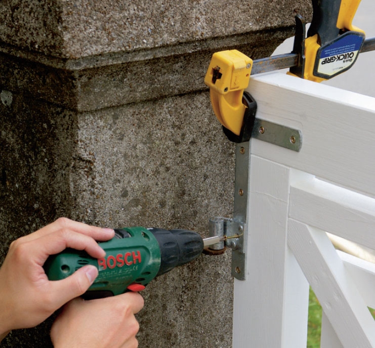 Når porten sitter som den skal, strammes tvinga rundt hengslet. Skru hengslet fast til porten med 4 x 40 mm skruer.