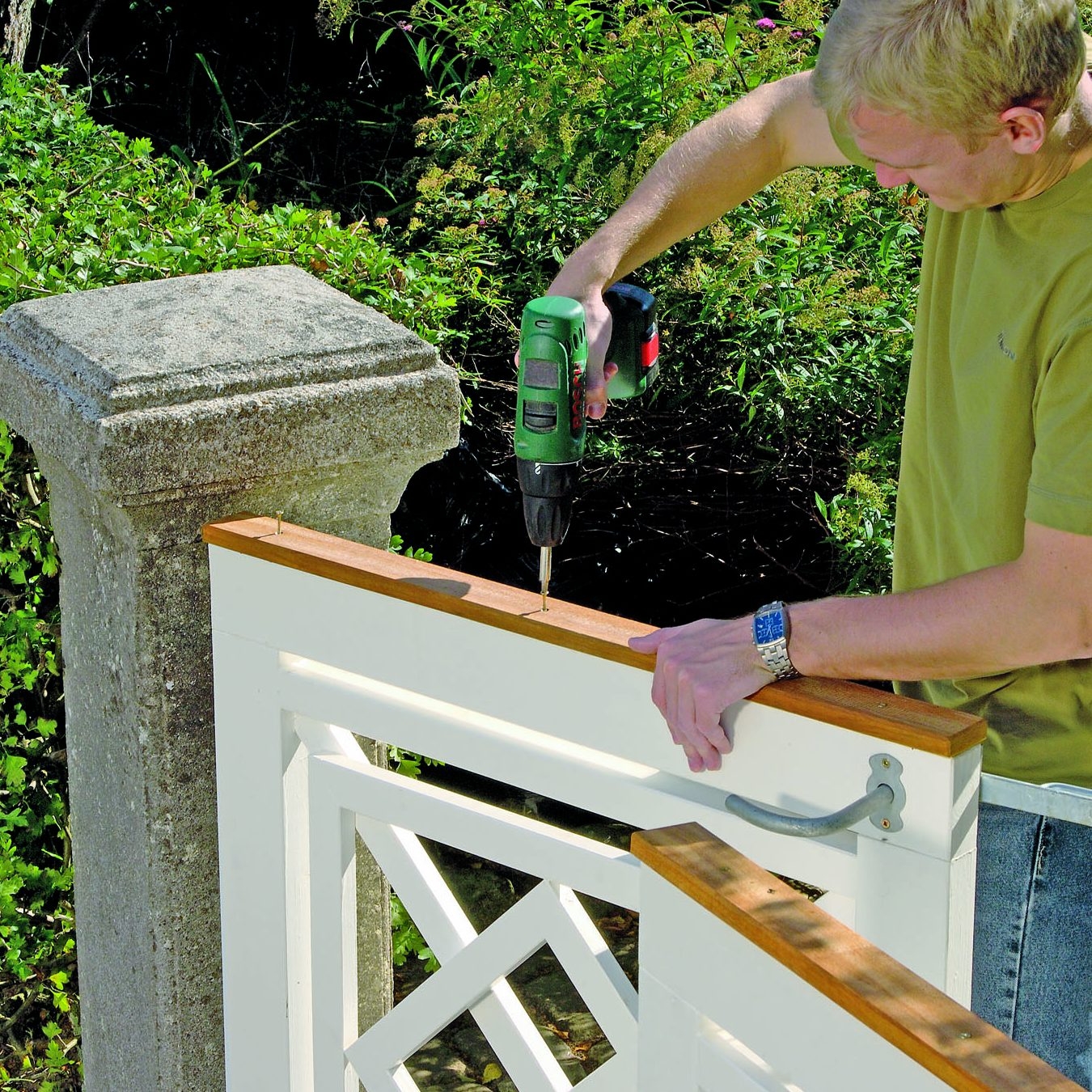 Skru fast krysset til ramma med 5 x 80 mm skruer. Her monteres skruen, så skruehullet vender skrått nedover - så blir det ikke fyllt med regnvann.