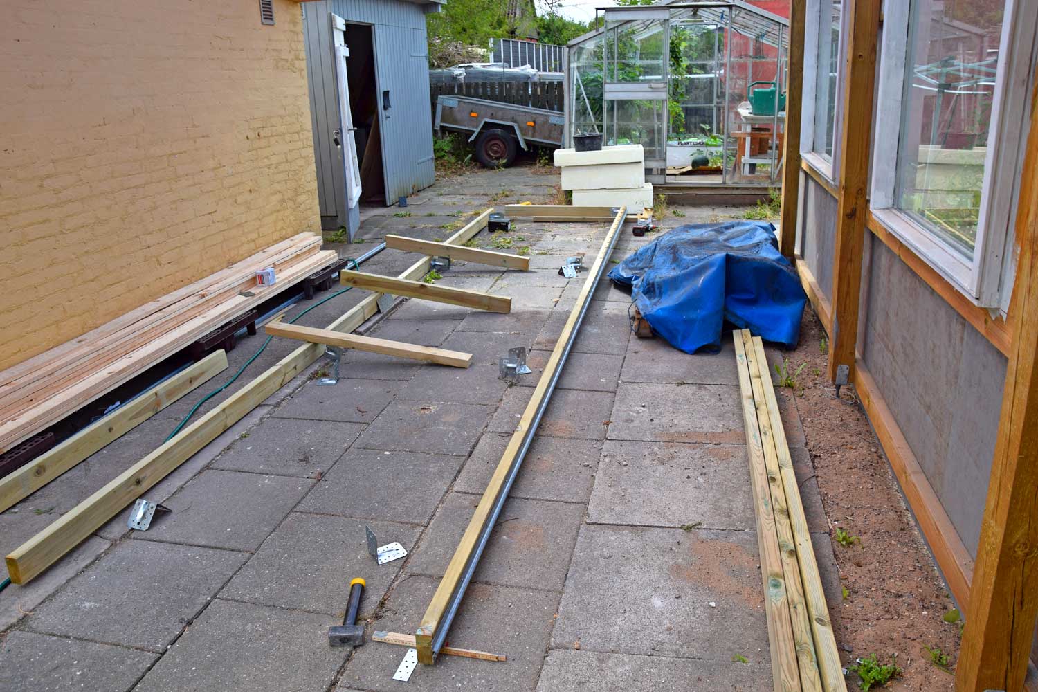 Rammen skrus sammen. Topp og bunn (D) består av to lengder på 360 cm og 240 cm, som er satt sammen med spikerplater. Toppskinnen (C) er montert, og nå skrus stenderne (E) også fast.