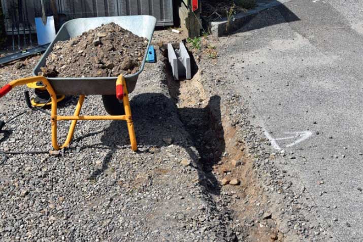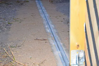 Skyveporten fungerer ved hjelp av et smart system med en toppskinne og en bunnskinne, som holder porten på plass. Bunnskinnen skal støpes fast til underlaget. Derfor graver vi en renne på tvers av innkjørselen og seks meter videre, for at porten skal kunne åpnes. Vi fyller rennen med forskalingsblok-ker, armerer dem med kamstål og fyller rennen med betong.