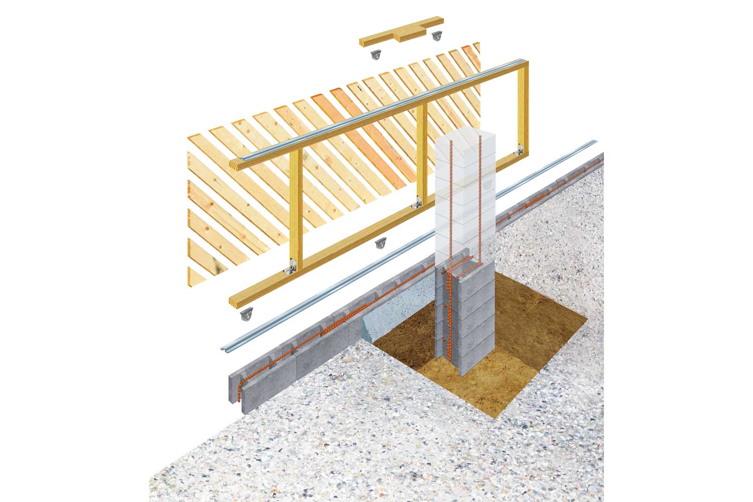 Bunnskinnen monteres på støperennen av forskalingsblokker, når betongen har tørket. Der rennen ikke er fylt helt opp med betong, fyller vi etter med grus som stampes hardt.