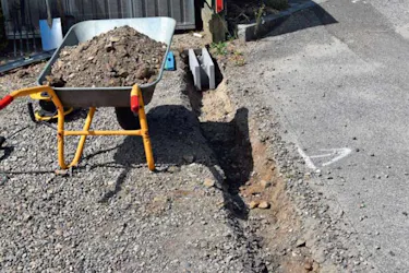 Vi graver ut til støperennen. Innkjørselen er nesten 100 år gammel, og den er vanskelig å grave i. Vi bruker derfor en borhammer med meisel for å løsne underlaget. Porten blir seks meter - derfor graver vi en 12 meter lang renne.