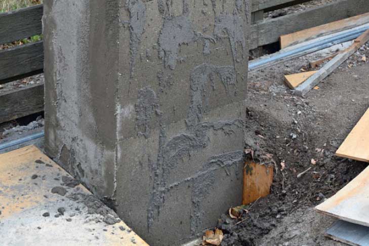 Søylen pusses. Vi lager et utkast av en tynn mørtel. Utkastet sikrer at pusslaget får bedre feste. Det skal få lov til å tørke i et døgns tid før søylen kan pusses.