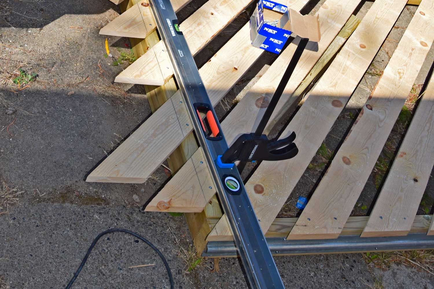 Siste stender (E) monteres. Alle stenderne skrus fast med to stk. 5 x 120 mm skruer i hver ende, og med vinkelbeslag i både topp og bunn. Det gir en god, solid ramme.