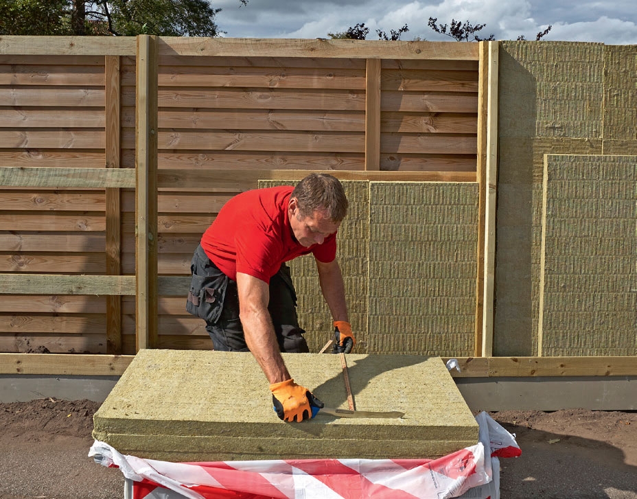 Da skal du bygge et støygjerde. Et støygjerde skal være høyt og tykt, slik at det kan absorbere lyd. Det består av et treskjelett som fylles med isolerende markplater på den siden som vender ut mot støyen. Det er viktig at siden med isolasjon er “åpen”. Ellers kan ikke platene absorbere støyen. På den andre siden bruker du kledning som på et vanlig gjerde eller levegg. Isolasjonsplatene skjæres nøyaktig til og plasseres i to lag med forskjøvede skjøter, så lyden ikke trenger gjennom. Derfor tar det litt ekstra tid å bygge.
