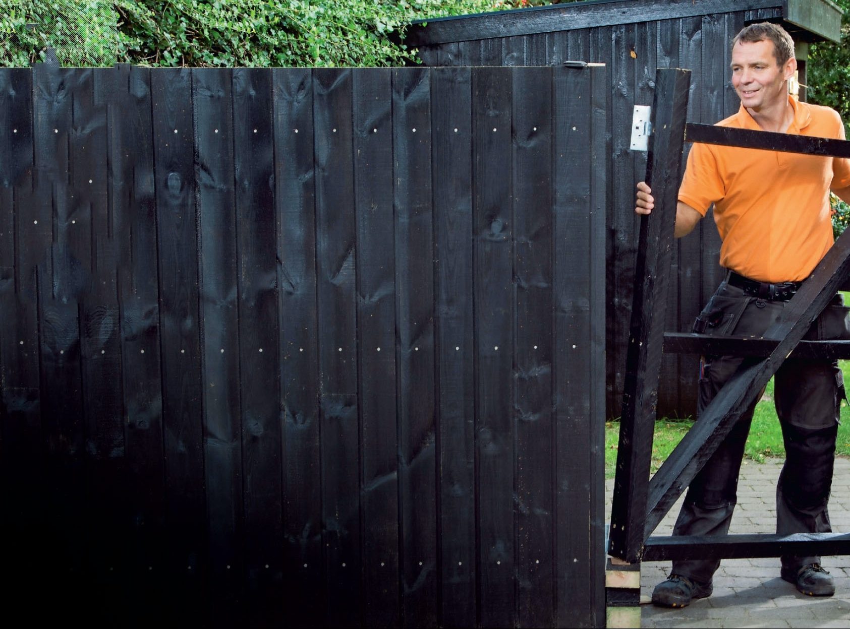 Da kan du for eksempel lage et gjerde med tømmermannskledning. Det er enkelt å tilpasse i høyden - bordene kappes bare til i den lengden du ønsker, så du kan fået høyt, solid og kompakt gjerde, som også hindrer gjennomsyn. Konstruksjonen er av trestolper med tverrstivere som kledningsbordene spikres fast til. Kledningen lages som en tradisjonell tømmermannskledning, med under- og overliggere. Kledningen skal ha trebeskyttelse for lengst mulig levetid. Regn med 15-20 år.