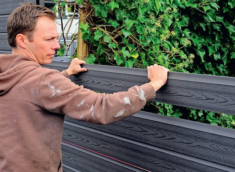 Da kan du velge et gjerde av kompositt. Hvis du ikke har lyst til å bruke mer tid på gjerdet når det først er bygget, kan du bygge et komposittgjerde. Kompositt er et blandingsprodukt av tre og plast. Det gjør at materialet tåler vær og vind godt, og har en lang levetid - typisk 25-30 år - uten at du trenger å vedlikeholde kompositten i alle disse årene. Kompositt kan dog falme etter et par år, men det kan friskes opp med spesielle pleieprodukter, hvis du vil ha den opprinnelige fargen tilbake. Gjerdet kan bygges med bord av kompositt, som legges ned i spor i H-stolper av kompositt eller tre.