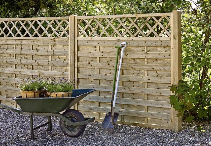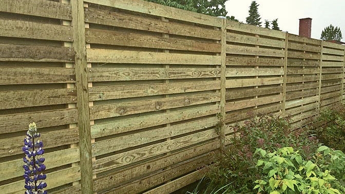 Da kan du velge et tett gjerde med liggende kledning. Du kan for eksempel bruke kledningsbord med fjær og not, som gjør at gjerdet blir helt tett. Bordene kan festes til H-stolper. De har et spor i hver side, som bordene plasseres i.