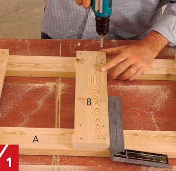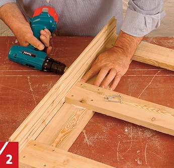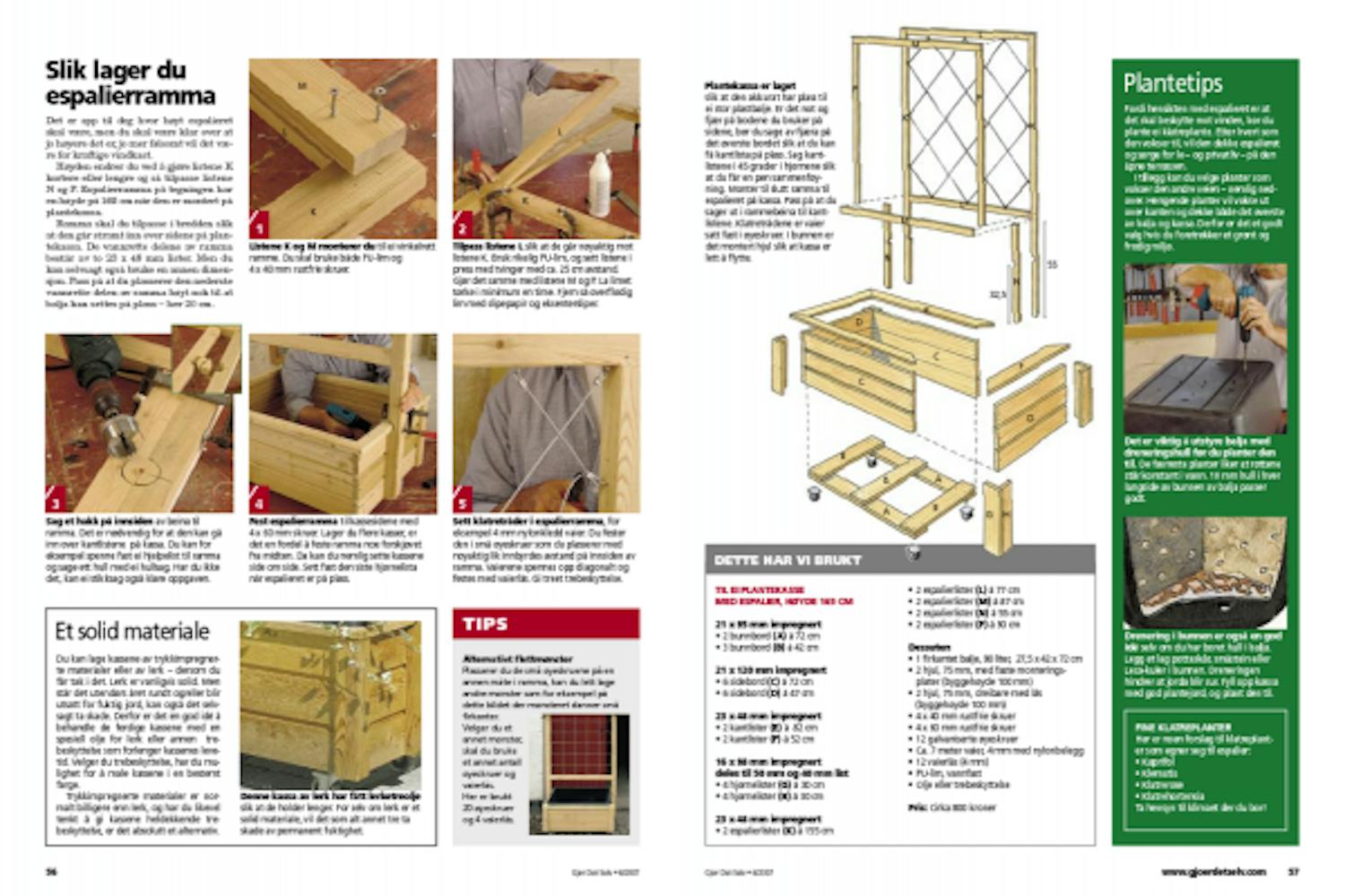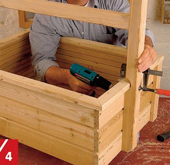 Fest espalierramma til kassesidene med 4 x 60 mm skruer. Lager du flere kasser, er det en fordel å feste ramma noe forskjøvet fra midten. Da kan du nemlig sette kassene side om side. Sett fast den siste hjørnelista når espalieret er på plass.