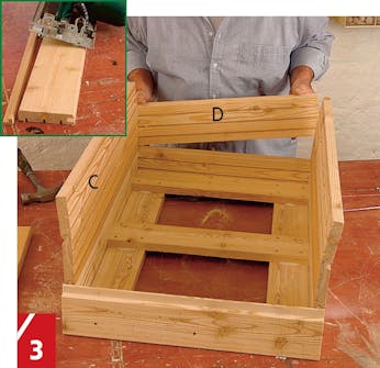 Montér resten av sidebordene. Bordene i de lange sidene (C) har samme lengde som bunnen, mens de korte sidene (D) er tykkelsen på bordene lengre enn målene på bunnen. Er det fjør på bordene, så sag av den øverste med ei stikk- eller håndsirkelsag.