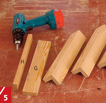 Lag hjørnelistene (G og H) av 16 x 98 mm glattkant som deles til to lister på 55 og 40 mm. De skal være 30 cm lange. Montér listene med PU-lim og tre 4 x 40 mm skruer slik at du får fire 90 graders hjørnelister.