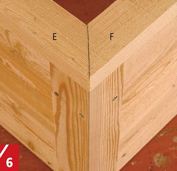 Fest tre av hjørnelistene med 4 x 40 mm skruer. Den siste hjørnelista fester du når espalieret er på plass. Kantlistene (E og F) sages i 45 grader. Plassér dem slik at de stikker 25 mm ut over de utvendige sidene på kassa.