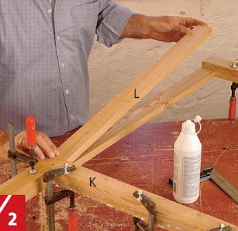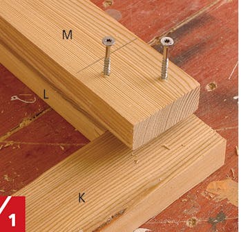 Listene K og M monterer du til ei vinkelrett ramme. Du skal bruke både PU-lim og 4 x 40 mm rustfrie skruer.